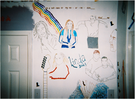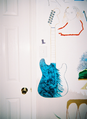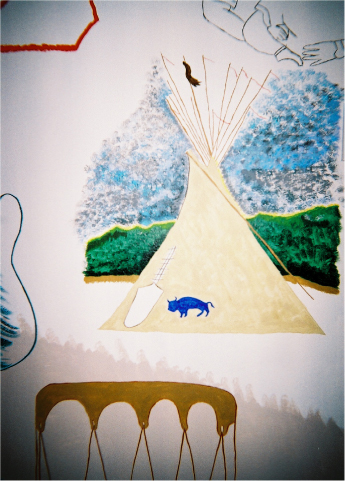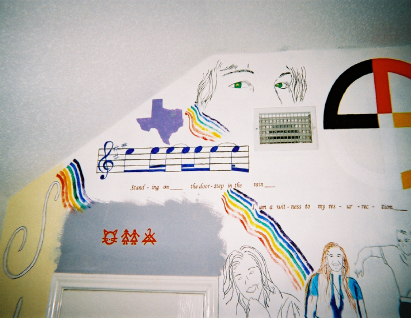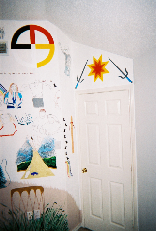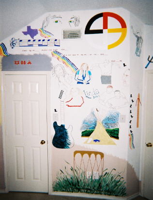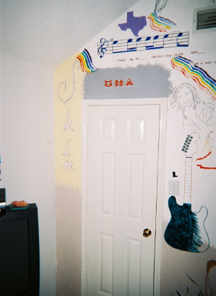 Above: The measure of music is from the albumn 'Skin', and lyrics from tracks 7 and 10. The measure of music by itself took eight hours. Below: The star above the door is a Lakota star. Okinawan sai's are pictured left and right of the star. To the left of the doorknob, is a native flute and a line of little dancing cowboy boots. Above them, at the top of the wall, is a firekeeper (generic).